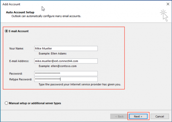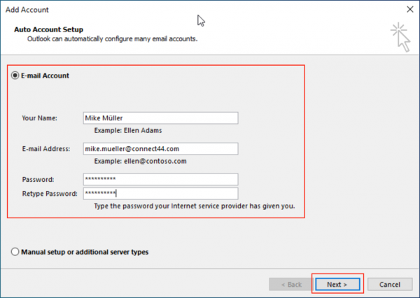A recent patch to Outlook >= 2016 changed the behavior how Outlook is handling Autodiscover. Since then Outlook always talks to Office 365 first. This causes a authentication conflict as our C44 Hamburg office is using Outlook 365 for some of the accounts. Therefore your Outlook has to be setup manually:
